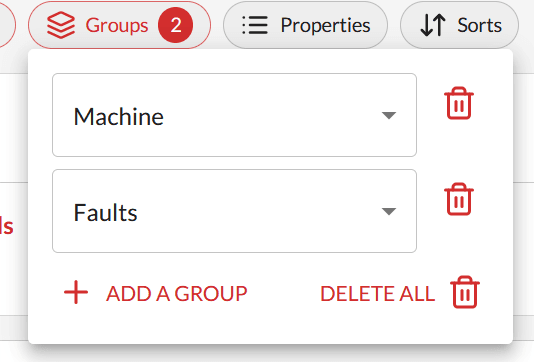 These pre-configured sheets enable daily tracking of machine faults from the previous day. The selection feature allows us to switch between different machines. To view this data, we first grouped it by machine, then by fault, and added a filter to display only events that occurred the day before.